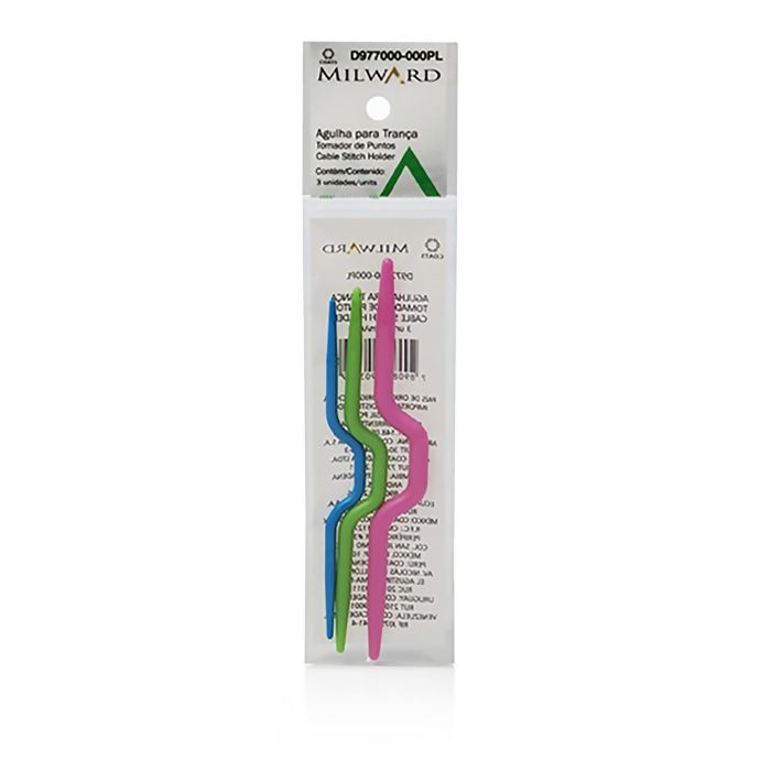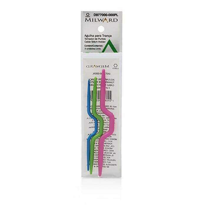 Prático conjunto de 3 tamanhos de agulhas para o auxílio na produção de tranças em tricô.