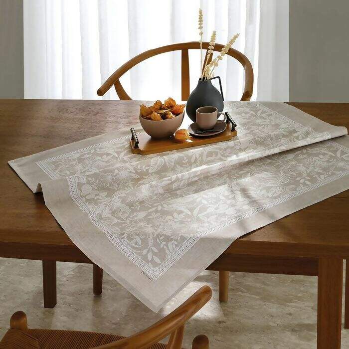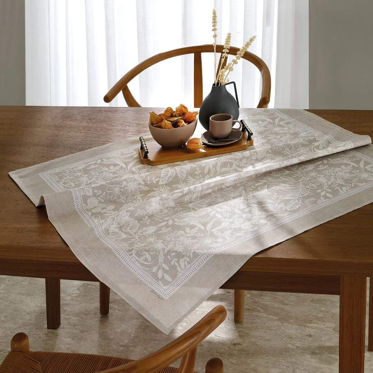 Com nova tecnologia de estamparia digital, a linha Renova é eco-responsável e possui estampas com desenhos ainda mais vívidos e ricos em detalhes. A toalha de mesa renova é produzida em tela mista 50% algodão 50% poliéster, com gramatura de 167 g/m², conta com o acabamento Döhler Clean, uma proteção especial contra manchas que limpa facilmente passando apenas um pano de imediato sobre o produto.