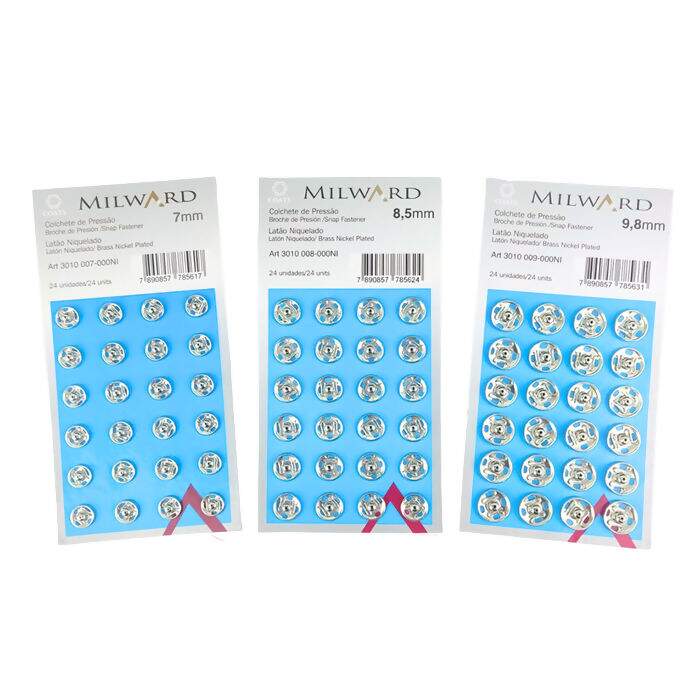 Colchete de Pressão Milward. Cada colchete é produzido com materiais de alta qualidade, assegurando que suas peças permaneçam firmemente unidas por muito tempo, o tornando assim um produto essencial para quem busca durabilidade, qualidade e versatilidade em suas criações de costura e artesanato. Com essa cartela de 24 unidades, você terá à disposição os melhores fechos de pressão do mercado.