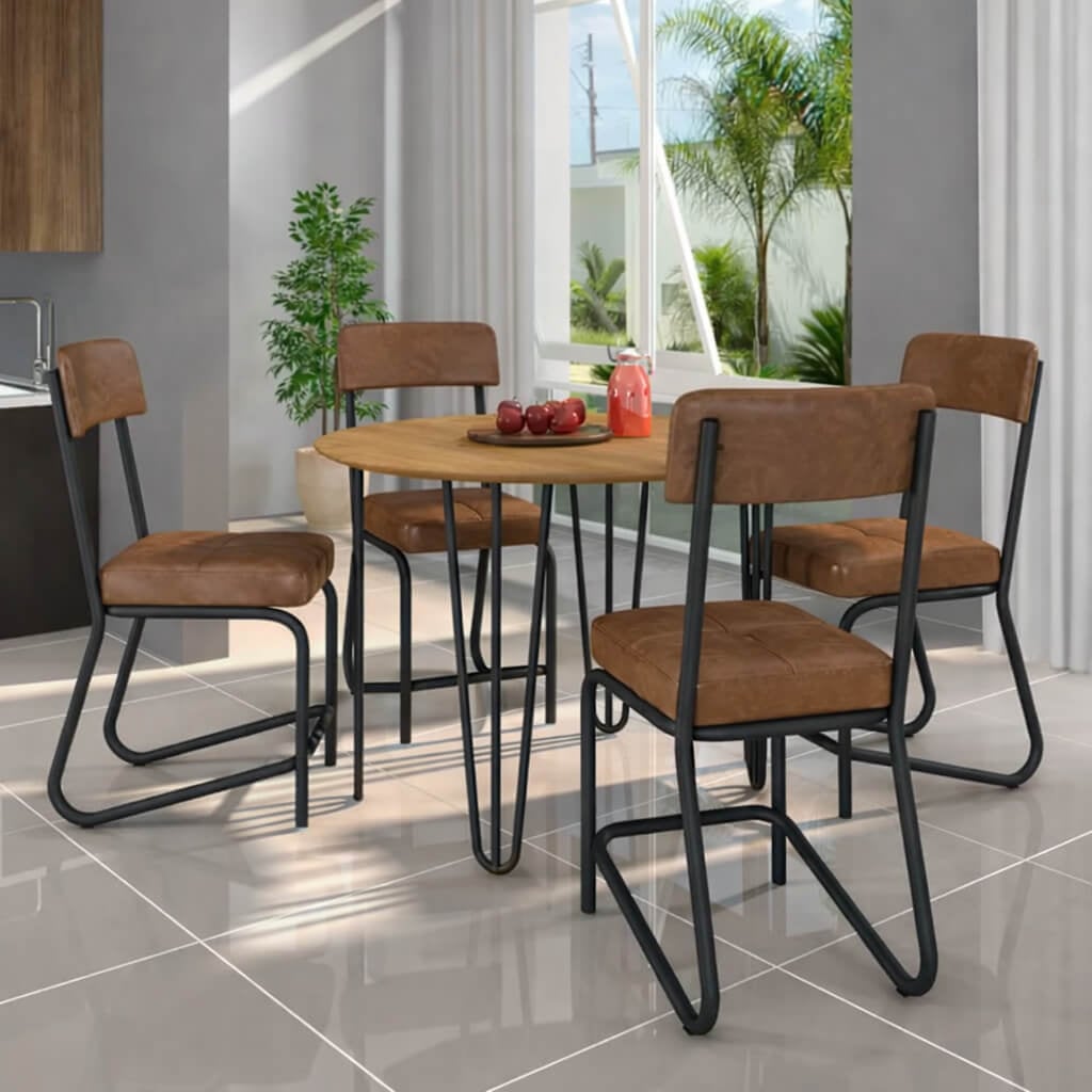 As cadeiras modelo Nagoia possuem assento estofado com espuma D14, proporcionando conforto ideal. O revestimento em courino agrega sofisticação e facilita a limpeza. Cada cadeira suporta até 90 kg na estrutura e 80 kg no assento.
