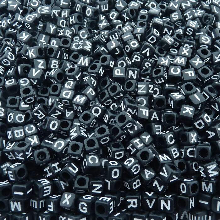 Pacote com 250g de letras sortidas pretas com branco para Bijuterias.