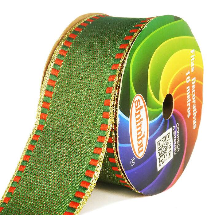 Descrição Fita Jeans Natalina 1834 Sinimbu Lurex Verde com Dourado 10m
