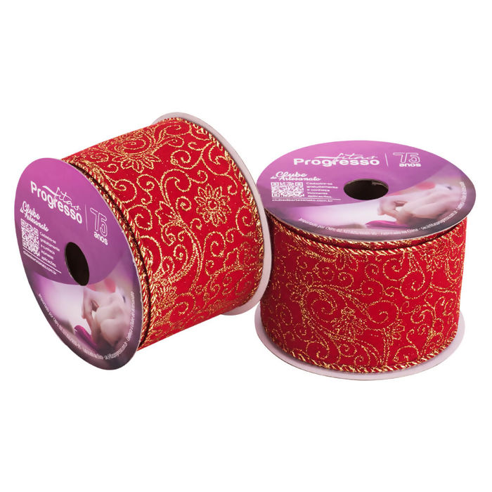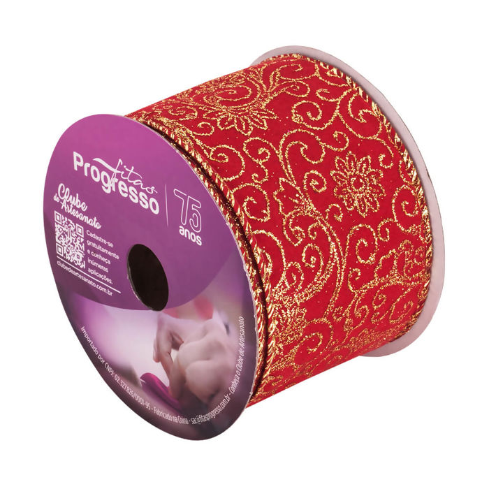 Descrição Fita Natalina Lurex FC016 Progresso 63mm - 209 Arabesco/Vermelho