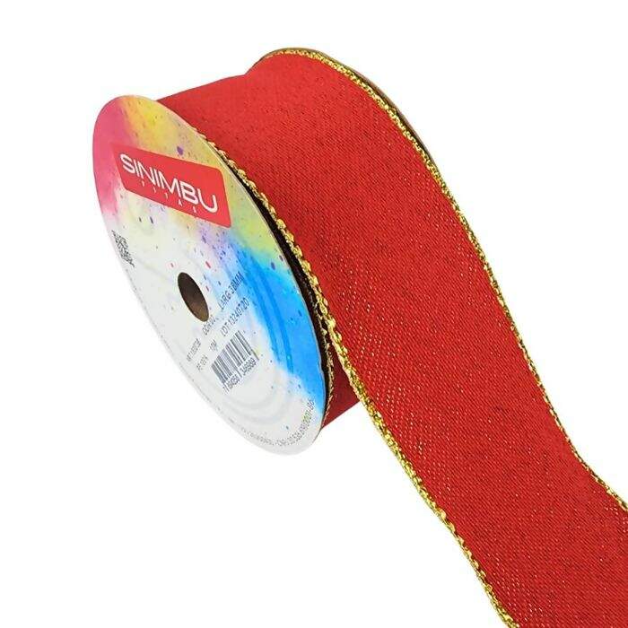 Fita de Natal Sinimbu modelo 1800 Cor 02 sem arame. Esta fita dupla face traz a alegria e o calor do Natal com um toque de elegância dourada para sua casa ou evento, tornando-o perfeito para celebrações familiares, festas temáticas e eventos especiais.