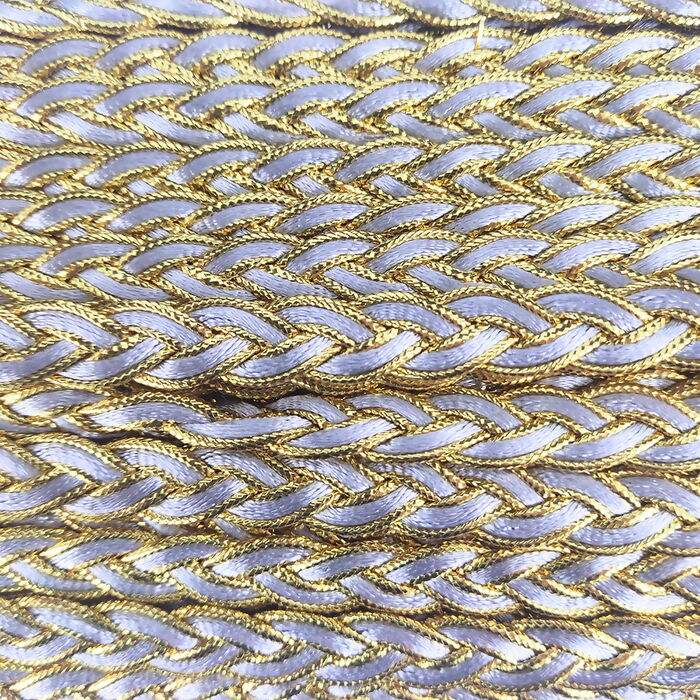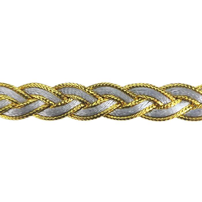 Galão Trançado 150901 Prata/Dourado. Ideal para seus trabalhos de decoração e artesanato, acessório decorativo, acabamentos em vários produtos, finalização de trabalhos manuais, caixas, trabalhos em tecido, trabalhos em scrapbook, enfeites em roupas e acessórios entre outras diversas utilidades.