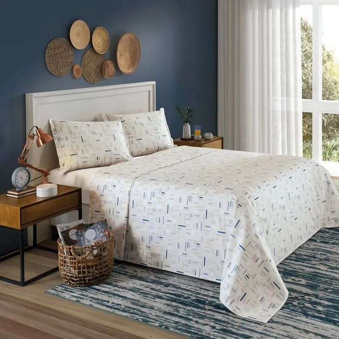 Jogo de lençol para cama, em popeline 100% algodão, 150 fios, em estamparia digital eco responsável que apresenta estampas em alto brilho com uma riqueza de cores e detalhes. Possui acabamento que proporciona toque macio e confortável. As fronhas possuem estampa corrida e 2 abas laterais. O lençol de baixo é com elástico e de cor sólida. 90 g/m².
