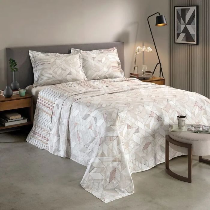 Jogo de lençol para cama em tecido 200 fios, 100% algodão, fio penteado, de toque agradável e encorpado, em estamparia digital eco responsável. O lençol de cima possui fino acabamento de dobra feita e as fronhas têm estampa localizada com 4 abas laterais. O lençol de baixo é com elástico e de cor sólida. 112 g/m².