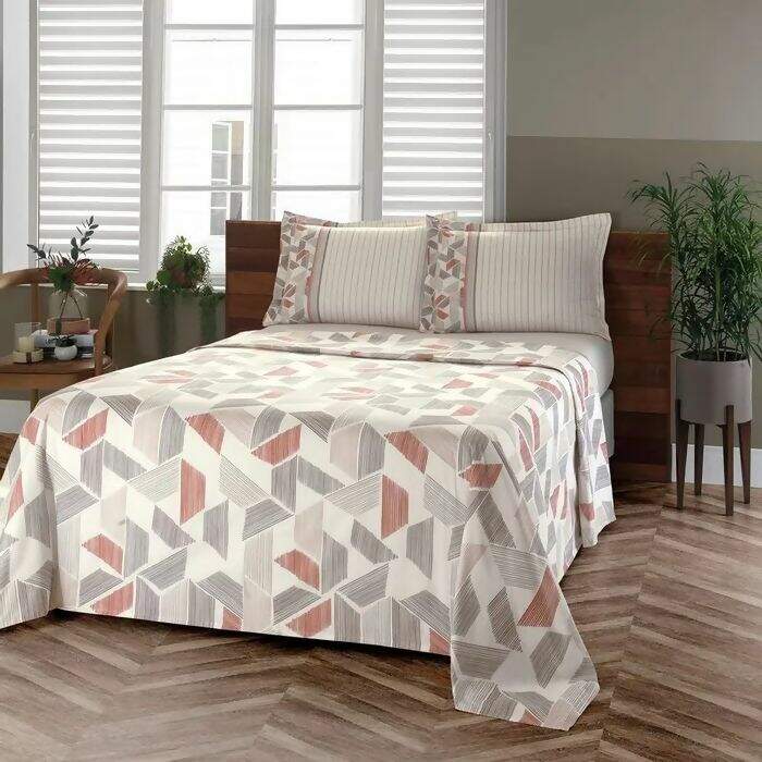 Jogo de lençol para cama em tecido 180 fios, 100% algodão, fio penteado, de toque agradável e encorpado, em estamparia digital eco responsável. O lençol de cima possui fino acabamento as fronhas têm estampa localizada com 3 abas laterais. O lençol de baixo é com elástico e de cor sólida. 110 g/m².