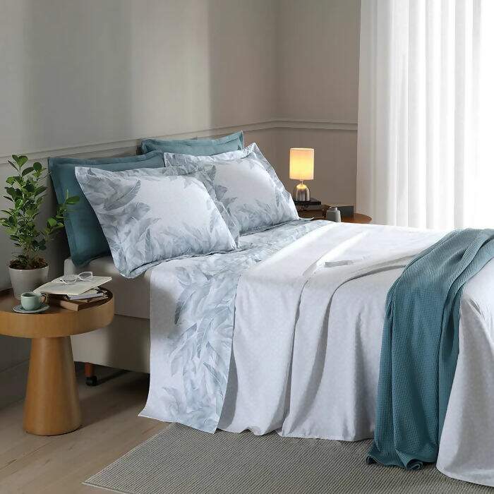 O Jogo de Cama Döhler Queen estampa Júlia traduz elegância e frescor para o seu quarto. Sua estampa de folhagens em tom azul transmite leveza e delicadeza, remetendo à natureza e criando um ambiente sofisticado e cheio de personalidade. É a escolha ideal para quem busca unir conforto e estilo na decoração.