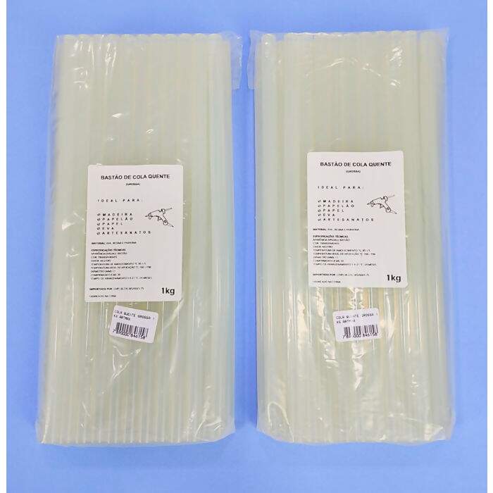 Kit com 2 pacotes de cola quente em bastão 1kg, usada para aplicação em tecidos, EVA, couro, madeira, papel, metal, plástico, e outros usos em artesanato.