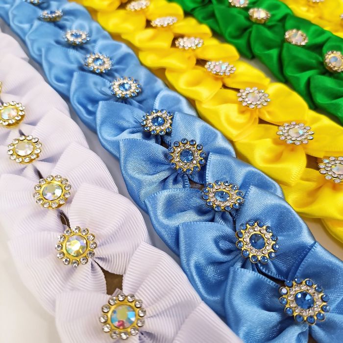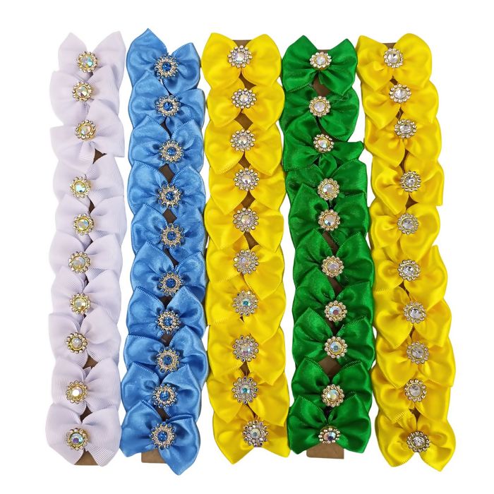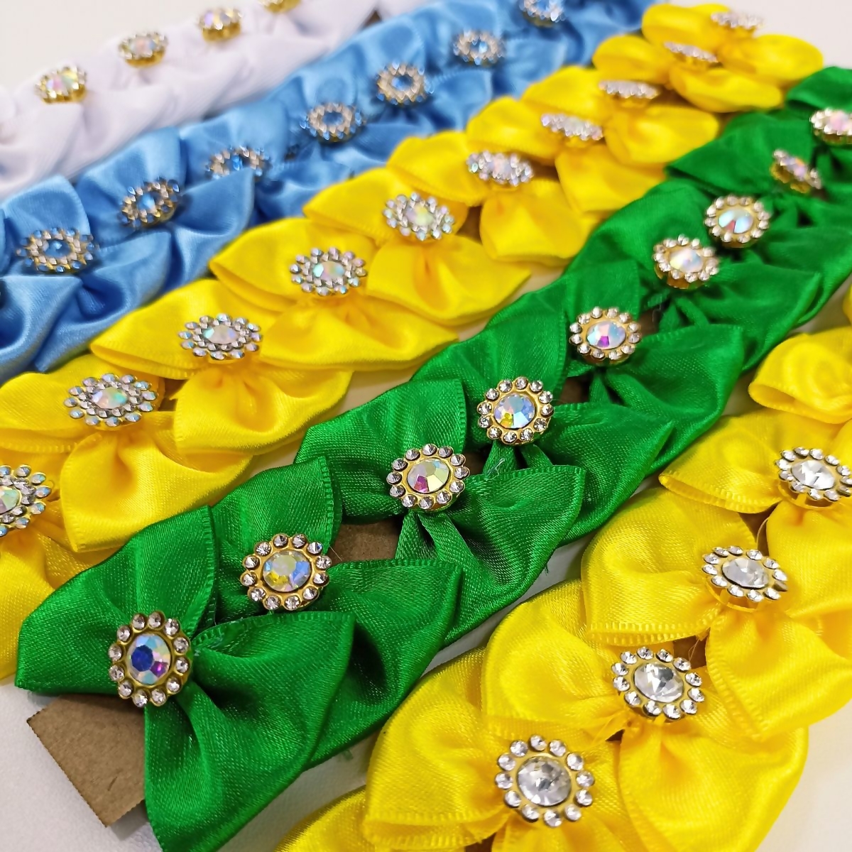 Com 50 lacinhos sortidos, o kit traz cores inspiradas no Brasil e em seleções internacionais, combinando tons vibrantes como verde, amarelo, azul e branco, todos com acabamento em pedrarias brilhantes, que garantem um visual sofisticado e encantador.