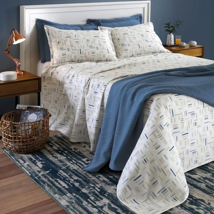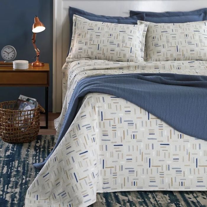 O kit Colcha Piquet Mael C é produzido em tecido 100% algodão e tem 305 g/m². É leve, fresco e muito resistente, além de ser macio e muito confortável. Seu tecido Piquet Favo tem um caimento perfeito sobre a cama, e o porta travesseiro que a acompanha possui 4 abas laterais que deixam a peça ainda mais elegante. A colcha possui costura em 2 lados, os demais lados recebem ligamento especial em seu entrelaçamento, fazendo com que não se desfaça no momento da lavagem ou em outro processo que aplicamos uma determinada força.