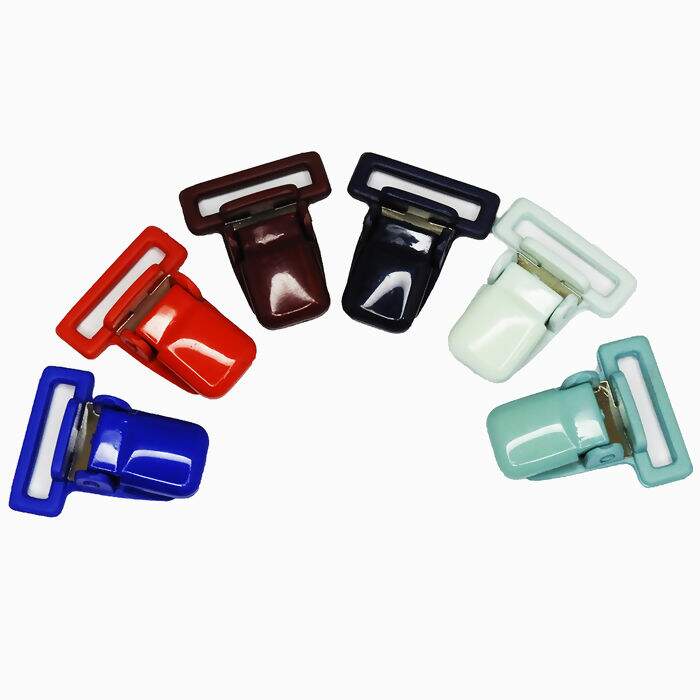 Presilha de plástico para chupetas com clips de metal interno.