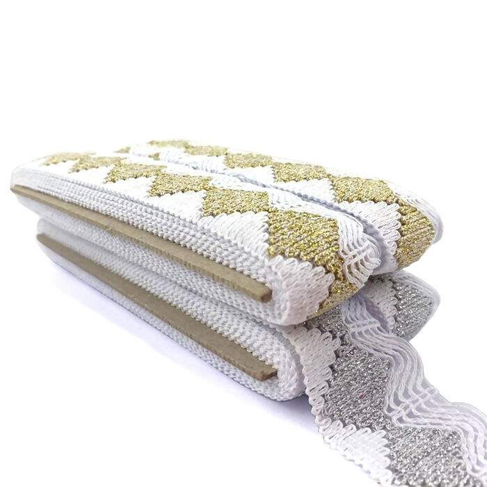 Descrição Renda de Algodão 6176/P Branco c/ Dourado 45mm São José - 10 metros