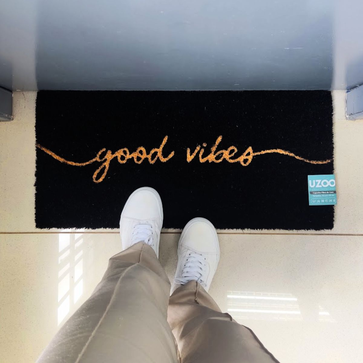 Dê as boas-vindas com estilo e positividade! O capacho Uzoo Good Vibes é perfeito para quem quer manter a casa sempre cheia de boas energias. Feito em fibra de alta qualidade, ele é resistente, antiderrapante e ideal para reter sujeira, mantendo seu lar sempre limpo.