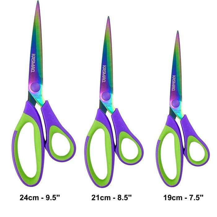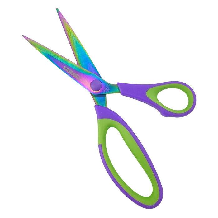 A Tesoura de Titânio Kasmaq oferece cortes precisos e suaves em diversos materiais. Disponível em 7,5" (19 cm), 8,5" (21 cm) e 9,5" (24 cm), possui lâminas em aço inoxidável com revestimento de titânio, garantindo maior durabilidade e afiação prolongada. O cabo ergonômico de plástico e borracha proporciona conforto e firmeza no manuseio. Ideal para costura, artesanato e uso profissional.
